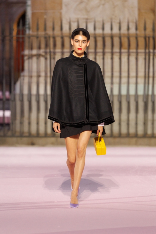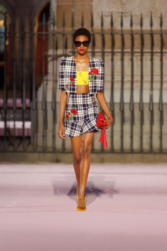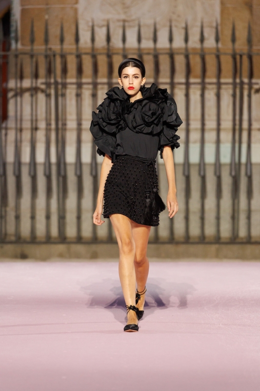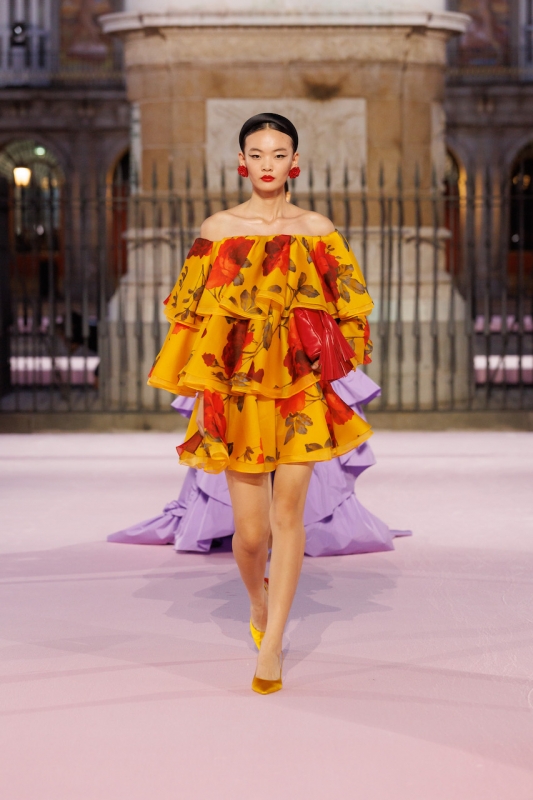 色彩成为主角,明亮而浓烈的调性呼应马德里的节奏与激情。从阳光般的saffron yellow到象征力量的Herrera red与深邃的Rioja,再到电光pink、violeta lilac、纯净白与极致黑,这些组合让人联想到Pedro Almodóvar电影世界中的大胆碰撞。整个系列的核心是花卉元素:Carnation以精致提花和刺绣呈现,Violetta化为轻盈的立体工艺,Retiro Rose则取材自El Retiro公园历史悠久的玫瑰园,在舞台上象征马德里将宫廷遗产化为大众美学的过程。
