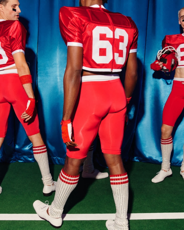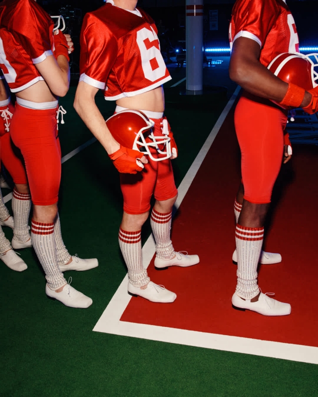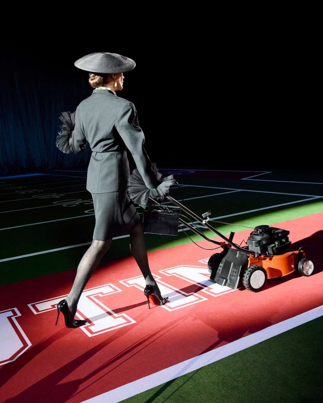 整场表演由五个章节构成,以欢腾的能量重塑美式 Homecoming 精神。啦啦队的挥舞、sapeur-pompiers de Paris 军乐团的节奏、舞者们化身奔跑的球员——一切都在灯光下闪耀。而那位被称作“如埃菲尔铁塔般法式”的模特推着割草机登场,轻盈而俏皮,为整个舞台定下了梦幻而幽默的基调。海马吉祥物穿梭其中,象征着 Louboutin 对幻想与自由的永恒热爱。