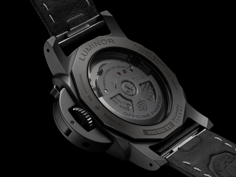 表壳以喷砂黑陶瓷打造,辅以五级钛金属透底表背与烟熏蓝宝石水晶,低调而深邃。表盘为黑色阳光放射纹「三明治」结构,搭配白色 Super-LumiNova® X2 夜光时标,层次鲜明而富有建筑感。腕表搭载 Panerai 自制 P.900/GMT 机芯,具备 3 日动力储存与停秒装置,精准稳健。其 12 小时制双时区功能致敬品牌早期 2000 年代的经典设计,成就当代旅人所需的时间自由。