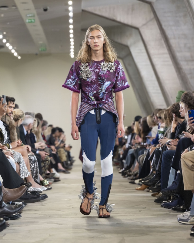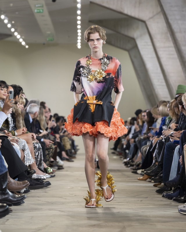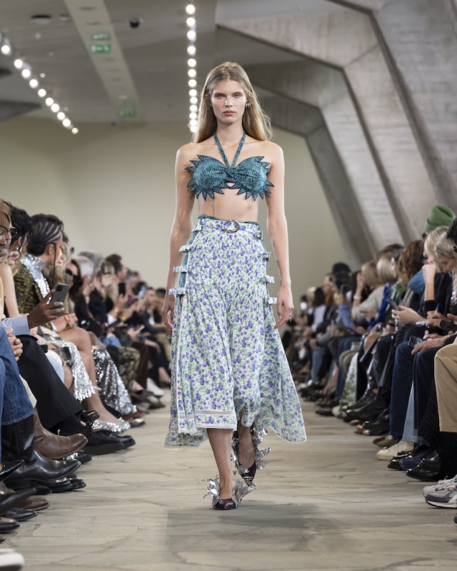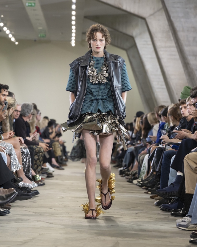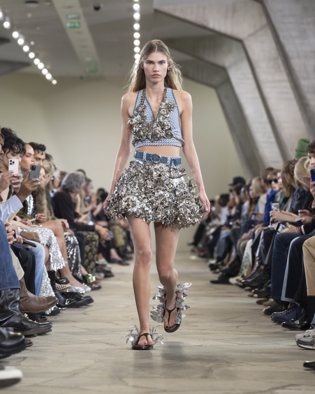 配饰部分完全是戏剧级别。car crash skirt 以 metal tiers 拼接,走路时金属会发出节奏般的声响;金属藤叶般的 pumps 从脚踝处自然弯折;bi-colour flip-flops 与 surf booties 以未来感方式重生。jewellery 像是夏日派对里的“可食用饰品”:silver floral lay、gleaming fruits、冰块吊坠,每一件都带着清凉与欲望。gradient patent disc bags 则具备 car-paint 般的光泽,为整体造型增添机械质感 。