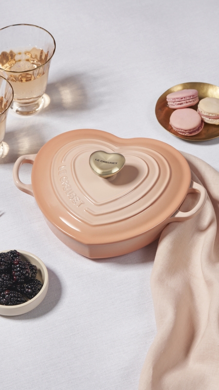 这一季的系列以heart-shaped cookware为核心,将情感转化为可被使用的器物。Stoneware与Cast Iron材质承载着Le Creuset一贯的工艺标准,而全新加入的Pêche色调,则为Valentine’s palette带来更清新、当代的视觉语言,与Cerise、Shell Pink和Meringue形成柔和而富有层次的组合。