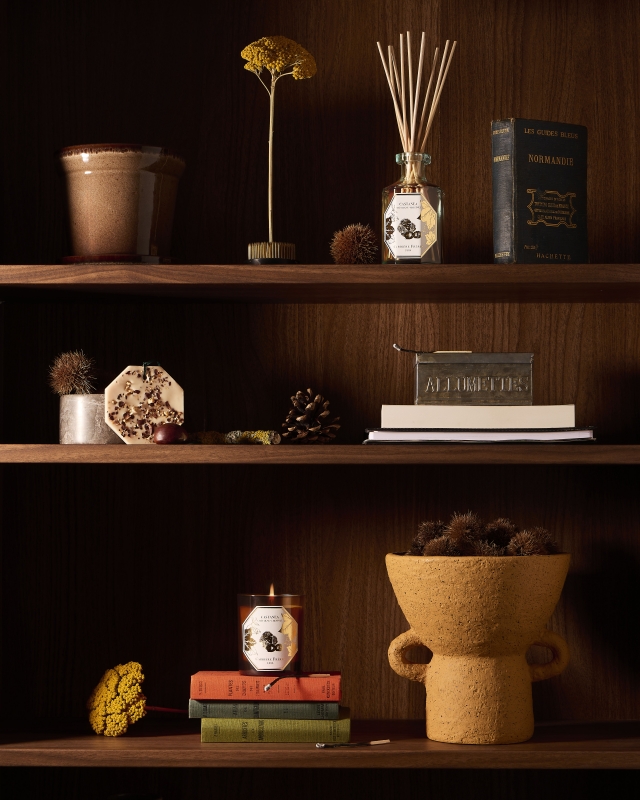 系列在视觉与材质上的处理同样延续了这一气质。深棕色烛杯呼应栗子的自然形态,低调却富有质感;米色植物蜡则为整体增添柔和与温度,使单品在空间中显得自然协调。无论置于厨房、客厅还是卧室,都能轻松融入,而不会打破既有的视觉秩序。