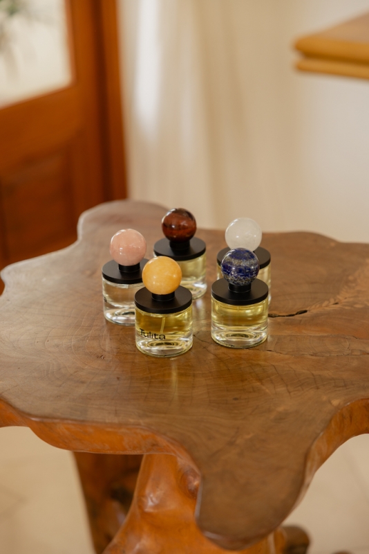 Every bottle is topped with a hand-carved, activated crystal that catches light beautifully — a sculptural detail that adds meaning and a tactile ritual to the daily act of applying fragrance. Once the bottle is empty, the crystal can be repurposed as a Gua Sha tool, extending the object’s life in a thoughtful way.
