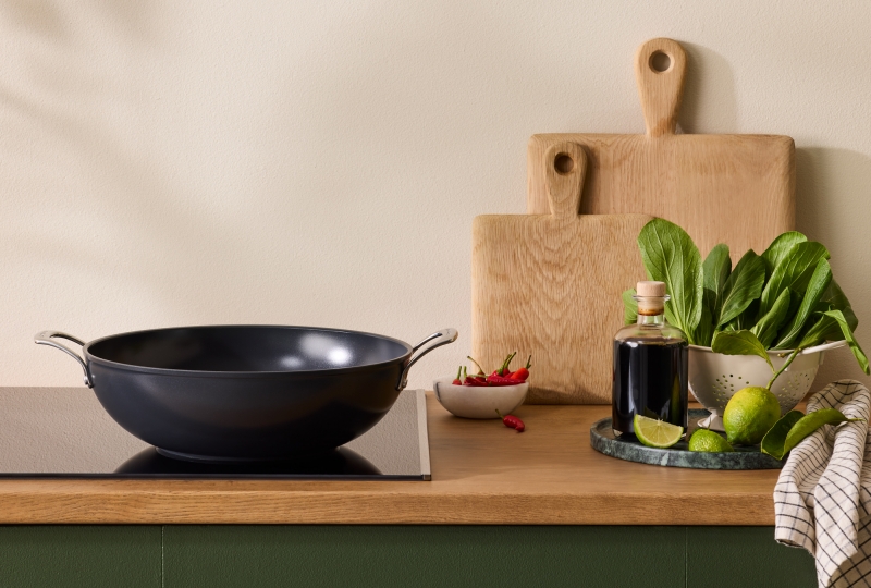 Essential Non-Stick Ceramic 系列采用重型铝芯,确保均匀的热量分布和保持,避免热点问题。其先进的无 PFAS 陶瓷涂层可轻松释放食物,清洁更加轻松快捷。耐用的表面不仅适合金属器具使用,还具有抗刮擦功能,让手洗变得更加简单。