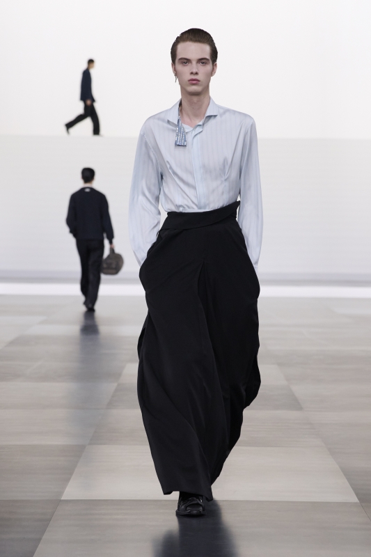 从第一套造型亮相的瞬间,Jones 便开启了一场变革的探索。一件大衣化身为裙装,礼袍与歌剧大衣在腰间勾勒出完美比例,版型在贴合与宽松之间游刃有余,每一个细节都承载着 Dior 对于男装进化的思考。高级定制的影响无处不在,丝绸与缎面的奢华质感被精准掌控,使整体轮廓既极致奢华,又充满可穿性,沉稳与华丽并存。