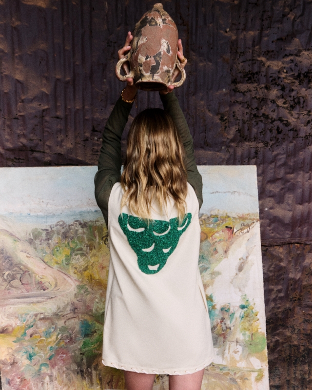 “我对这次创作的思考方式,就像一场考古发掘。”Folk如此描述ARTEFACT的灵感来源,“不断寻找、研究、挖掘,只为创造出具有集体意义的作品。”这一理念贯穿整个系列,每一个符号、每一根丝线、每一颗宝石,都是对历史的诉说。翡翠吊坠凝聚着爱与联结的灵性,酒神Bacchus的图腾点缀其间,诉说着狂欢与丰饶的寓意。图案跃然于面料之上,酒瓶绿的真丝欧根纱铺展着醇厚的风韵,奶油色丝绸缎面上绣着层叠细腻的绒绣工艺,让过去与现在交融,赋予作品不朽的魅力。