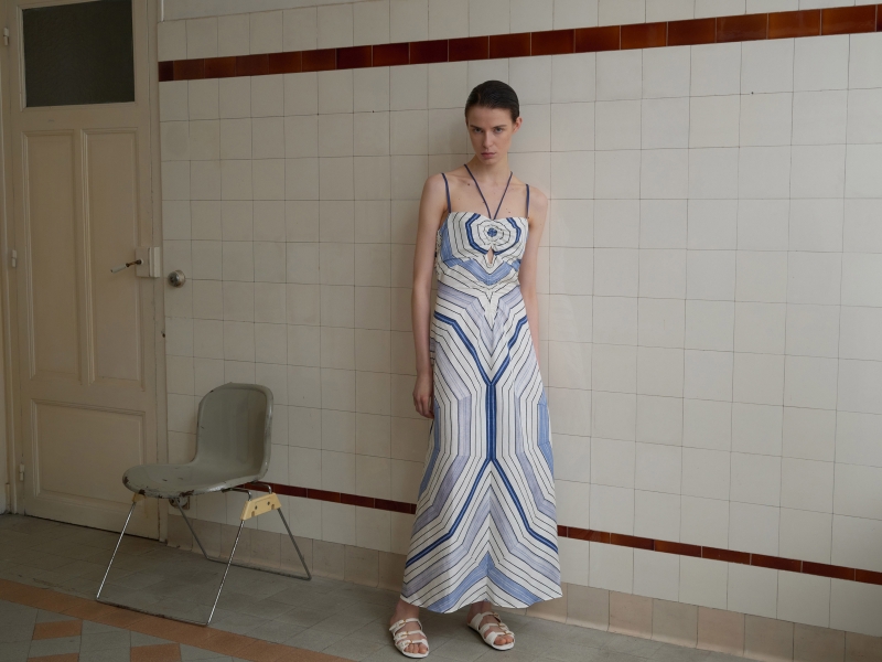 Evelyne Chetrite带领设计团队,不再关注潮流与消费主义,而是深入Louise的创作符号中去寻找女性内在的张力。那些来自家庭旧衣的布料,在艺术家的手中被解构重组,如今在SANDRO的设计语言中转化为条纹拼接伞裙、轻盈亚麻衬衫与梦幻斜纹连衣裙,仿佛夏日地中海微风下,记忆轻轻展开。