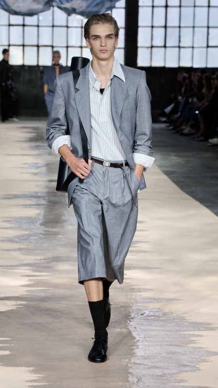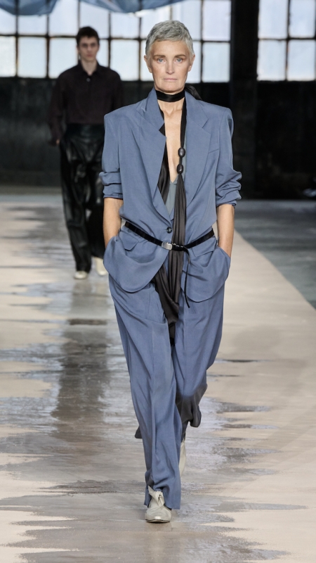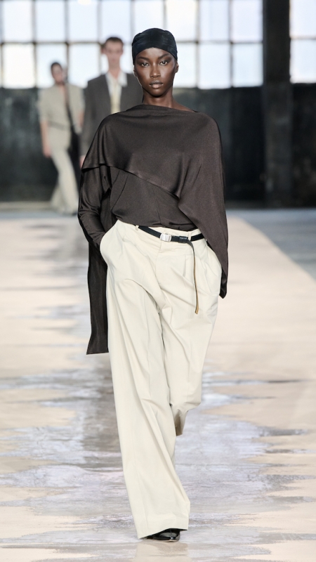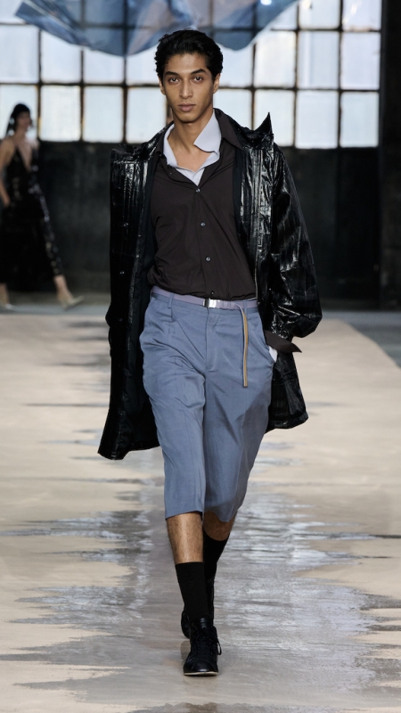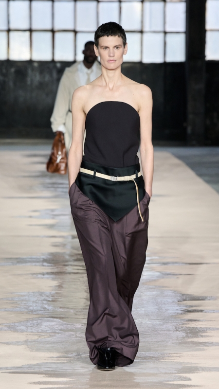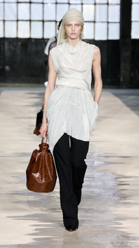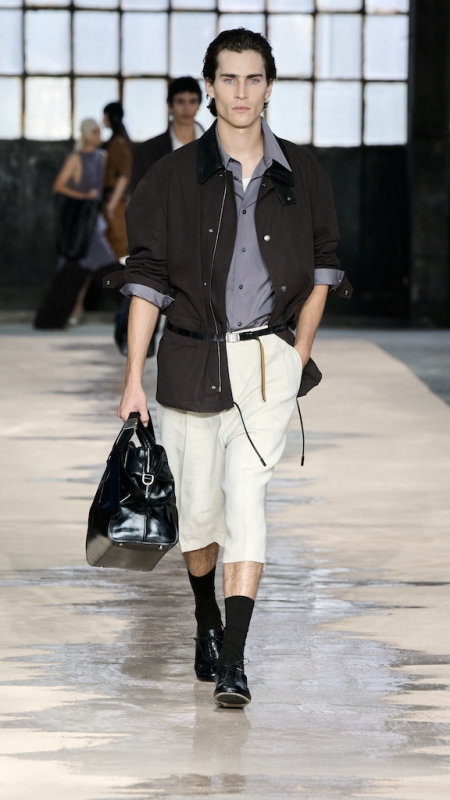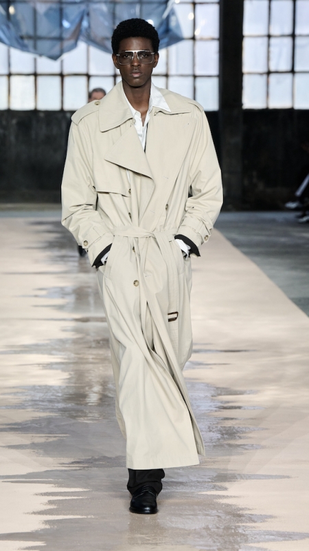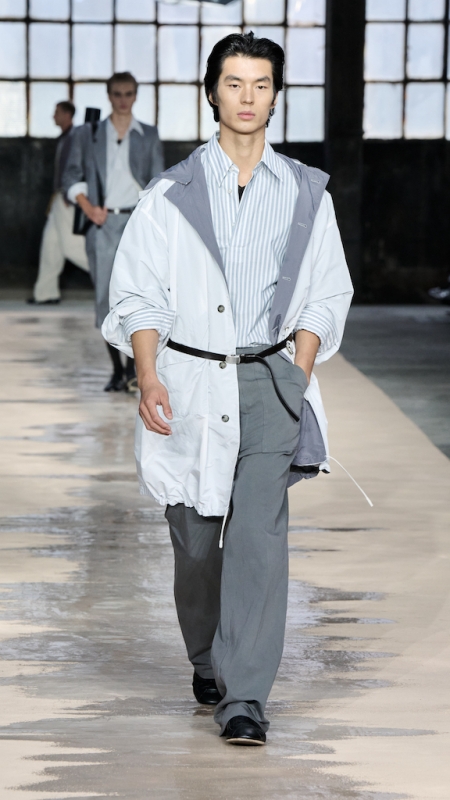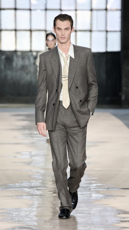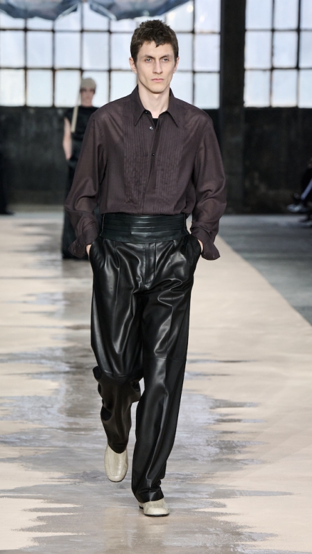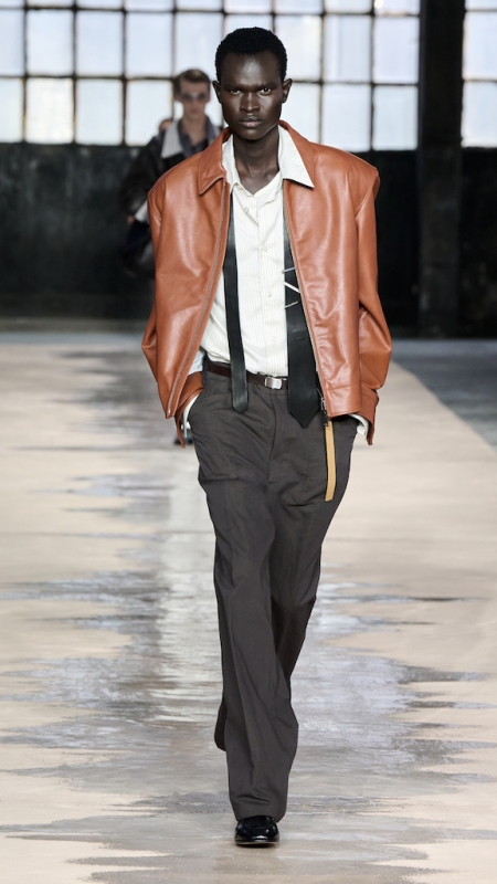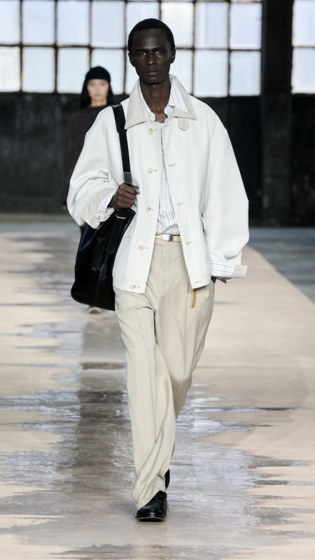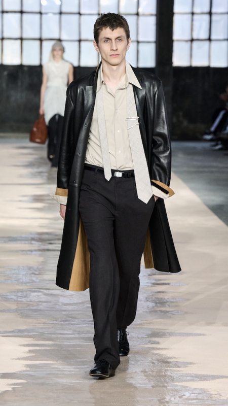 Menswear 继续推动这种“不平衡的平衡”。本季的 suiting 明显变得更轻松,肩线更柔和,裤型更宽阔。sandstone glow 的 canopy viscose suit 成为秀场中的强势造型之一;white bonded leather jacket 用 sculpted shoulders 与 defined waist 强化结构感;technical wool overcoat 与 raffia-like knit sweater 的组合,把硬朗与柔软拼成一种新的层次。ties 被用 clips 固定在 unbuttoned poplin shirt 上,讲述一种精心设计的随性。