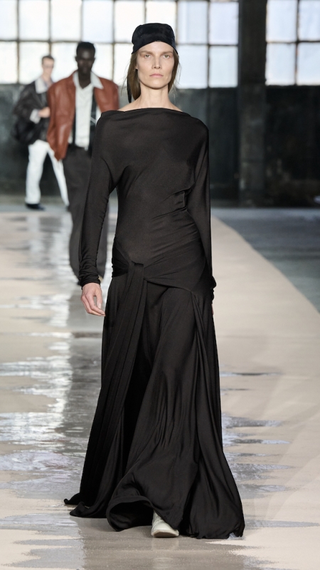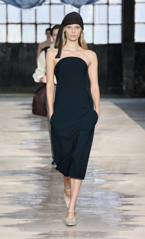 Womenswear 将矛盾写得尤为明显。mocha jersey top 的 slanted neckline 在身体上形成意外的褶裥流动,light-sand chino trousers 用 sweeping hemlines 把线条延伸到地面。黑色 strapless dress 外表高级克制,却藏着 pockets 的实用细节;sable sleeveless dress 叠穿 cigarette trousers,既正式又轻盈;black coffee dress 以 sack silhouette 展现松弛感,但背后却是 sharply plunging V-back 的凌厉处理。连 BOSS 最具标志性的 trench coat 都被重新演绎,用 pleats 创造出轻轻漂浮的视觉效果。