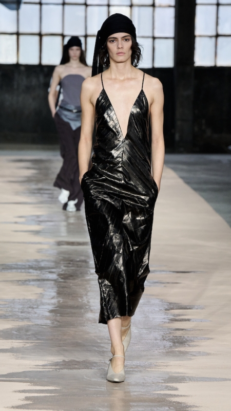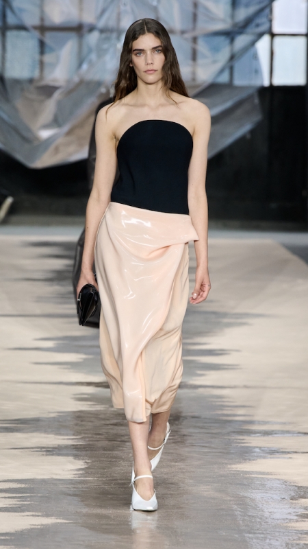 Accessories 则把主题延伸得更彻底。Revers bag 以 blazer neckline 为灵感,结构利落,是本季最具识别度的新包型,提供 suede 与 leather 两种材质。鞋履则维持 close-to-barefoot 的轻盈感,从 pointed flats 到 sneakers 都采用 ultra-thin leather sole,让造型更贴近身体的自然状态。细腰带与 cummerbund 均以低腰方式呈现,重新设置季节比例。