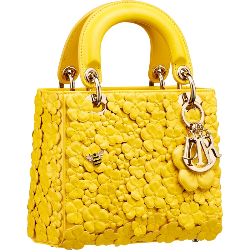 Mini Lady Dior Buttercup 则以立体 yellow buttercups 覆盖包身,带来更鲜明的季节氛围。一只小巧的 bee 藏身花间,延续 Dior 对自然意象的长期探索,“D, I, O, R” charms 则让整体回归品牌核心语言。