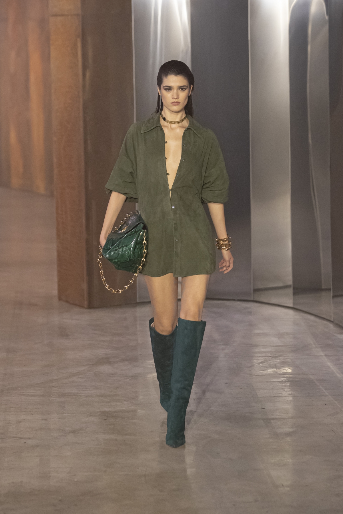 本季从物质的万神殿中汲取灵感:真丝天鹅绒的虎纹西装、夏季羊毛的双排扣剪裁和山东丝绸睡衣,以轻松的阳刚态度彰显女性气质。在 Villaseñor 的家乡洛杉矶制作——工程牛仔布与 BALLY 皮革工艺的无数表达相得益彰,从黄油般柔软的绒面革到抛光小牛皮、弹力小羊皮和华丽的金属色。传家宝衣橱单品以意想不到的颜色和组合出现,从经典的飞行员夹克到宽松剪裁的西装、风衣和狩猎风格的单品。