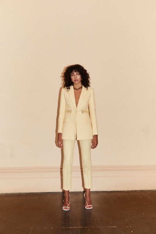 Rebecca Vallance 23 秋冬系列旨在唤起感官,利落的剪裁、戏剧性女性廓形以及华丽色调的毛绒托盘相平衡,并被赋予大量精美微妙的细节——低调的紧身胸衣以及手工贴花的金色花卉图案,栩栩如生。