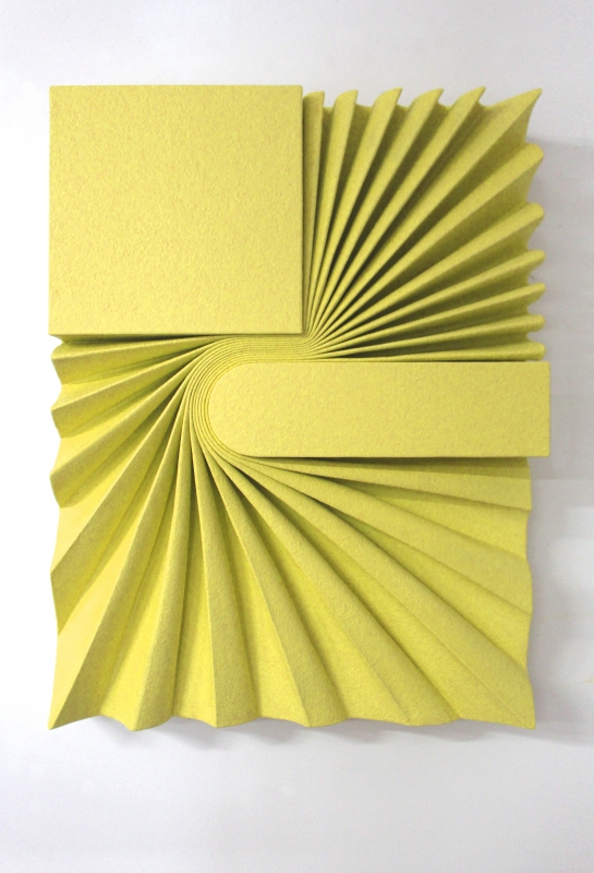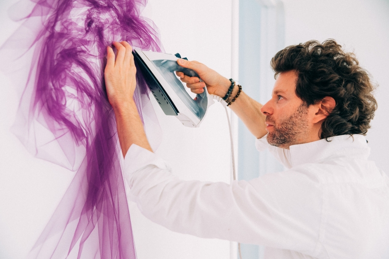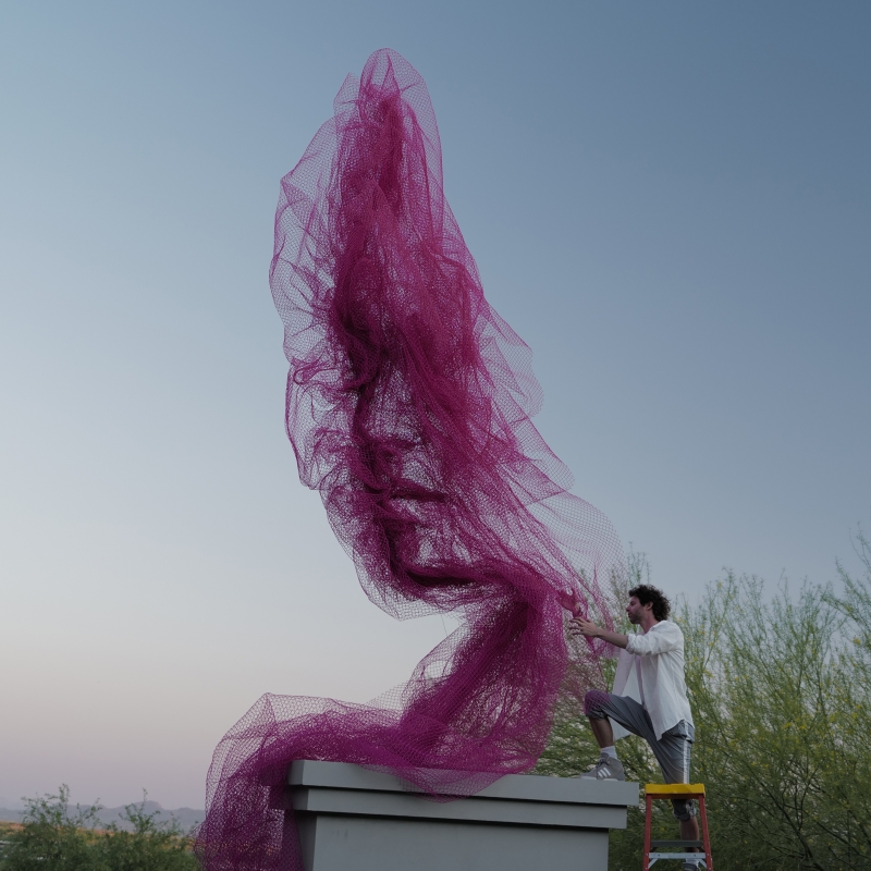 Anchored by two of his iconic tulle pieces, the exhibition introduces striking new works in resin, metal and mixed textiles. Each reveals the artist’s obsession with the fold as both method and metaphor. “It all stems with the simple fold,” Shine explains. “Whether painting with layered tulle, creating resin-infused felt sculptures, or achieving gravity-defying forms in metal, I wanted to show the different creative opportunities afforded by each material.”