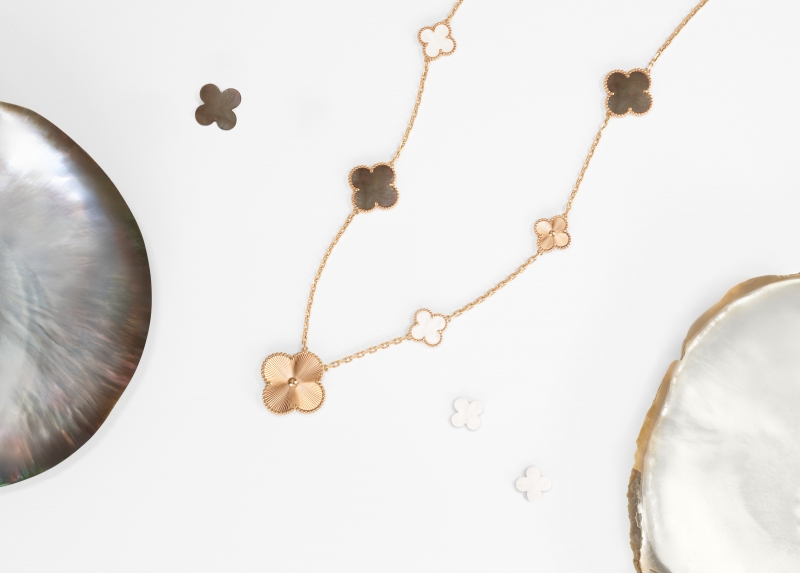 The new Magic Alhambra Transformable Long Necklaces are a celebration of fluidity and elegance. For the first time, these long necklaces can be styled in multiple ways — as a statement-length piece, a short necklace, or even a bracelet. Crafted in guilloché rose or white gold, they combine mother-of-pearl and chalcedony with signature golden beaded contours that play beautifully with light. Every clasp and proportion has been meticulously designed to ensure balance and grace, with hidden mechanics preserving the illusion of seamless perfection.