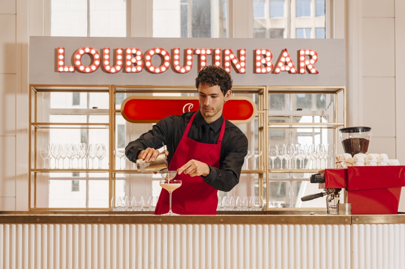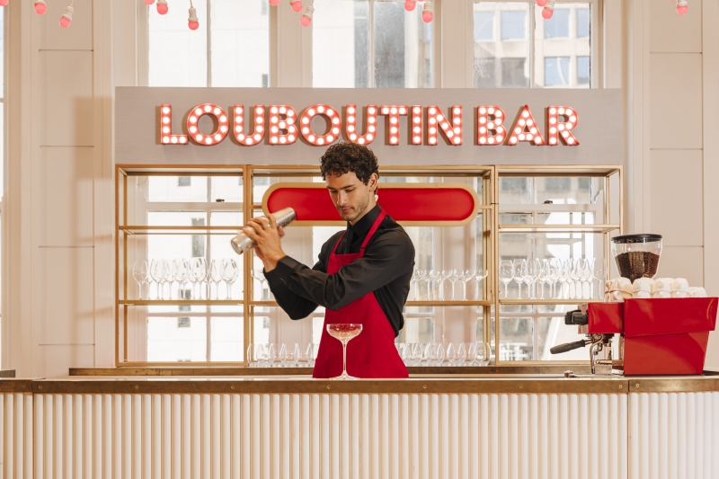 The bar sits just steps away from the Christian Louboutin boutique, glowing like a jewel box under soft illumination. Designed with the charm of a Parisian brasserie and the mischief of Louboutin’s creative spirit, the space is crowned with velvet chairs embroidered with the brand’s monogram—an invitation to sink in, exhale, and surrender to a moment that feels both indulgent and intimate.