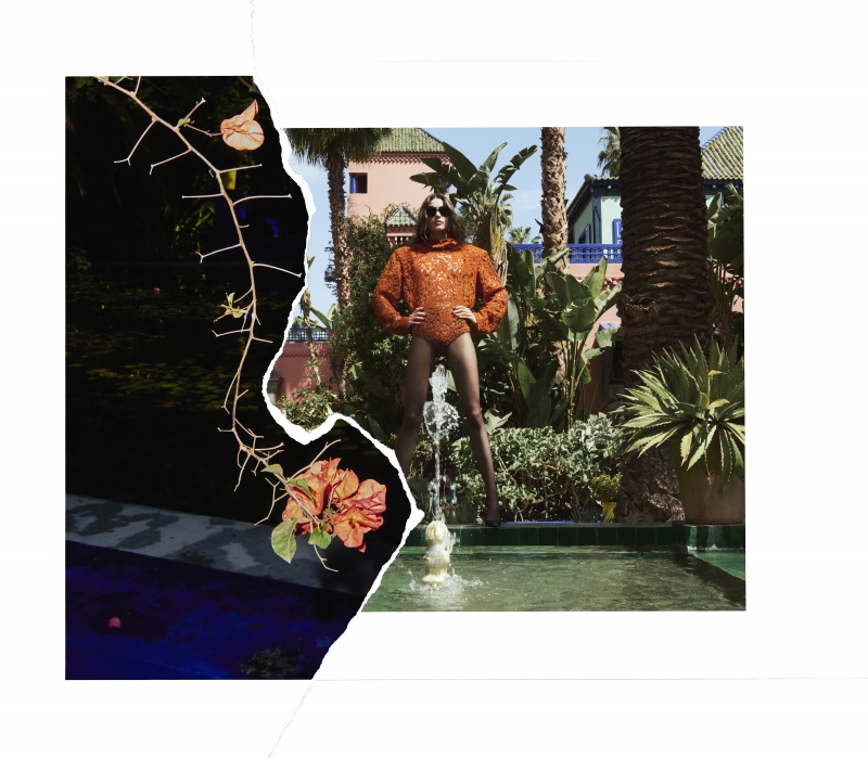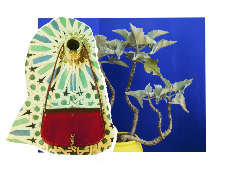 The campaign unfolded not as a tribute, but as a confrontation. Sharp silhouettes cut across planes of intense color, photographed by Drew Vickers in compositions that felt almost tectonic. Every surface carried the sensual contradiction of Marrakech: ochre walls radiating heat, zellige tiles saturated to near surrealism, the fuchsia glow of dusk folding into the dense blue of the garden. These were not memories. These were elements alive again, burning in the present.