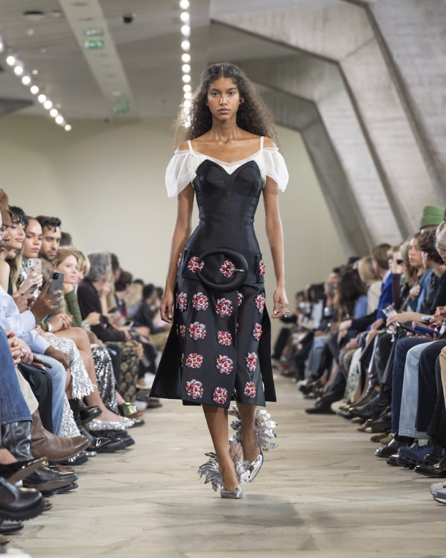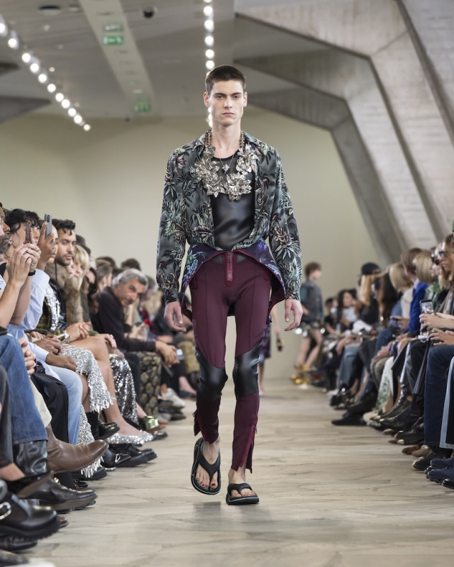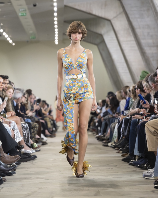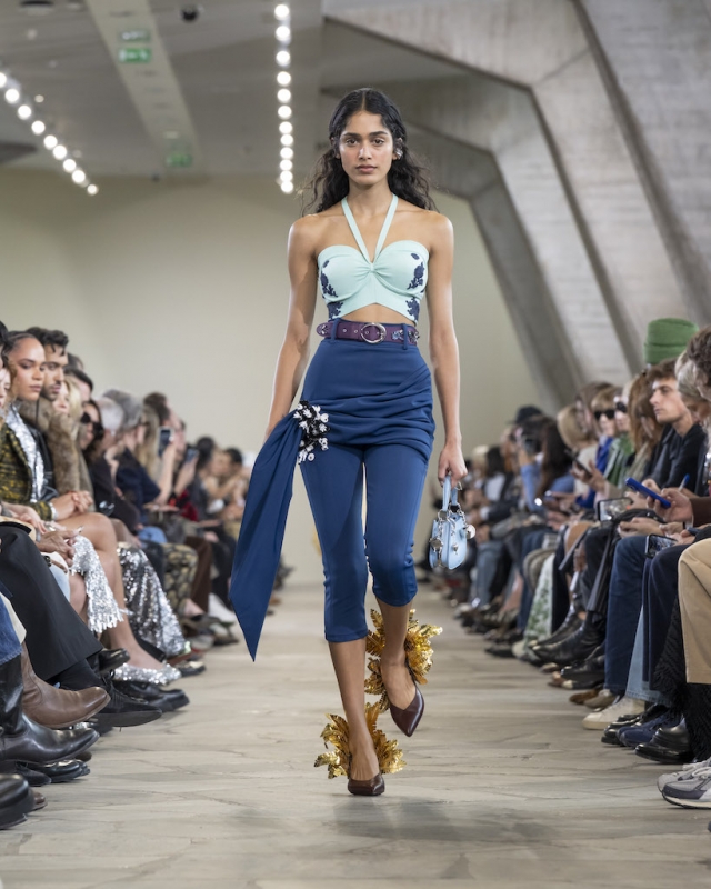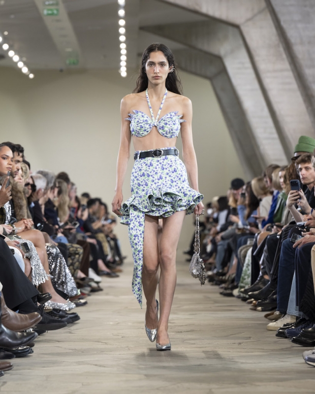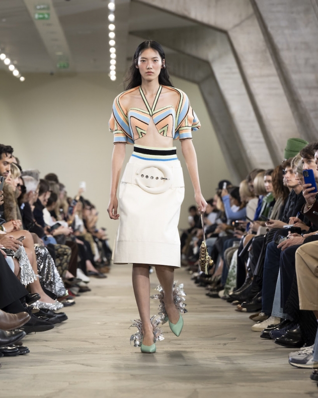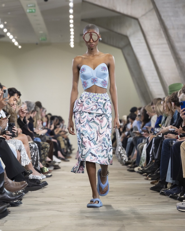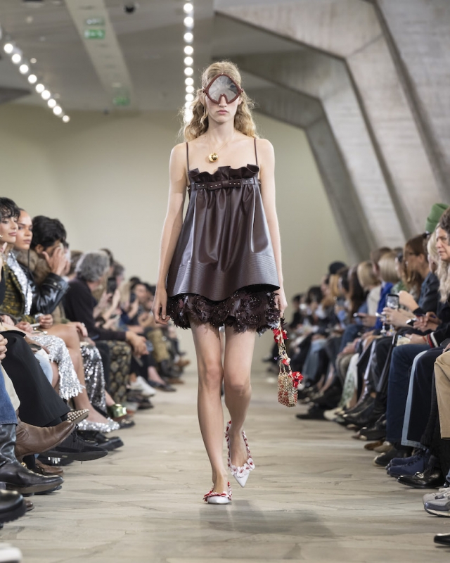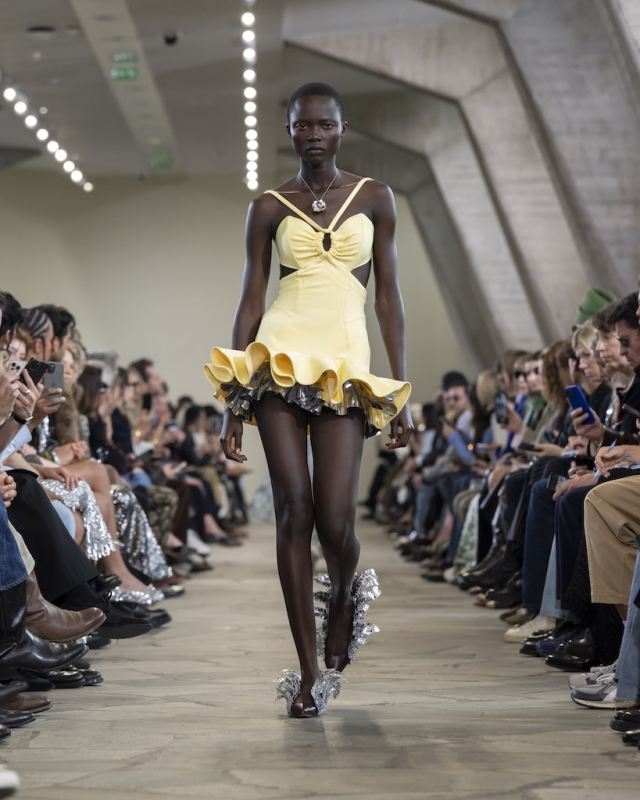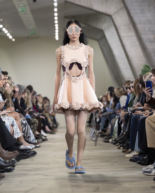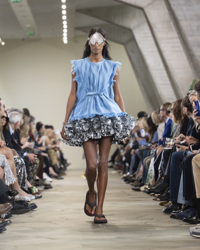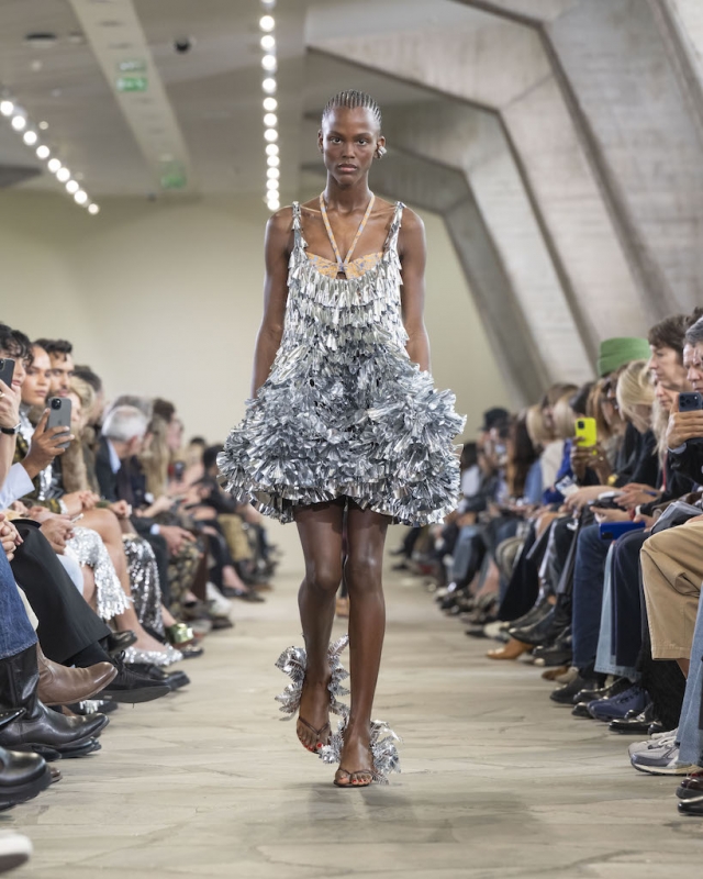Accessories amplified the drama. A car-crash skirt made of articulated metal plates echoed with each step, turning movement into sculpture. Metallic pumps curled like unfurling leaves around the ankle. Flip-flops were redesigned with exaggerated soles. Surf booties became daywear. Jewellery looked edible—silver leis, glossy fruit charms, even ice cubes hanging from chains. Gradient patent bags gleamed like fresh automotive paint, giving the collection its sleek, mechanical shine.