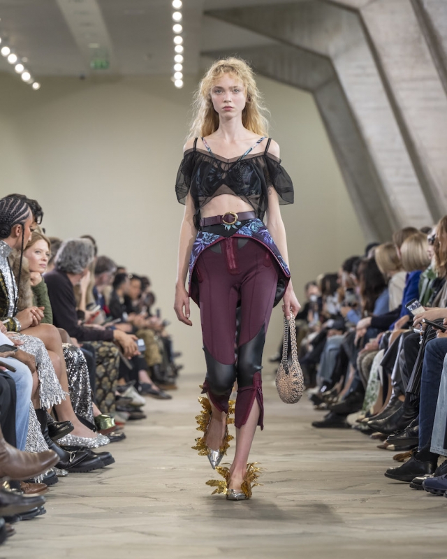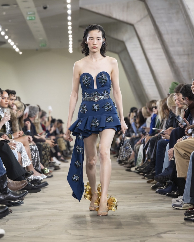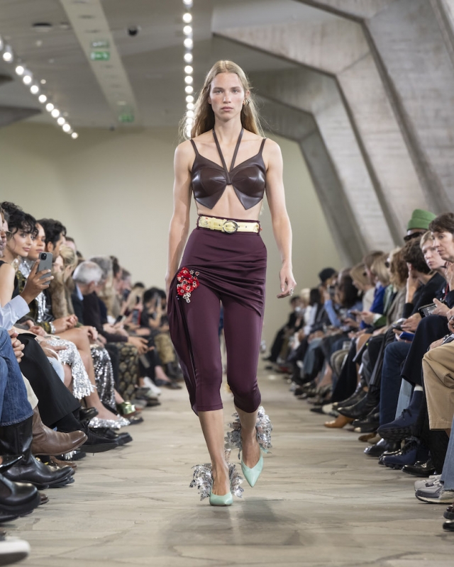 Then came the disruption. Pieces appeared intentionally undone—pulled apart, reassembled, knotted, tied. Short skirts draped into unexpected trails. Pencil skirts dropped lower with exaggerated belts, shifting the proportion rules with rebellious precision. It was Rabanne’s version of elegance: sensual, defiant and rooted in the body.
