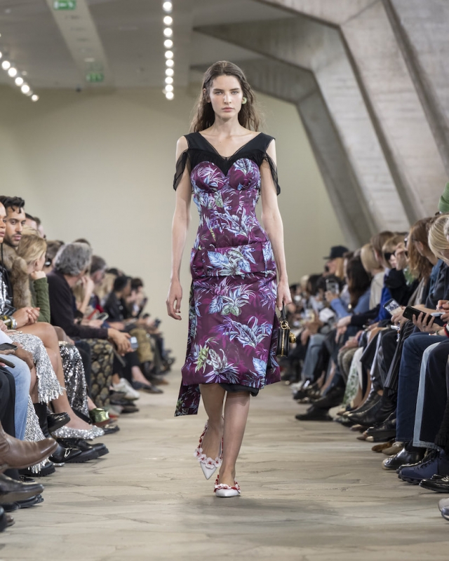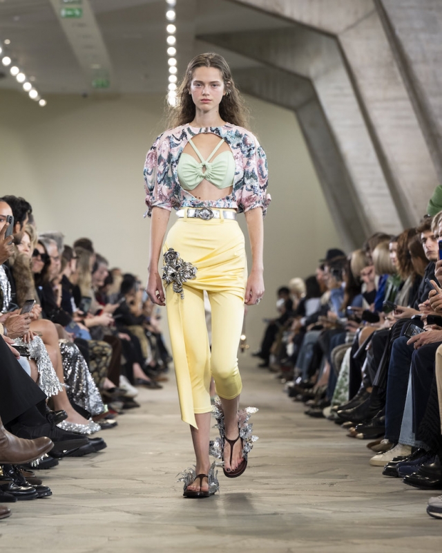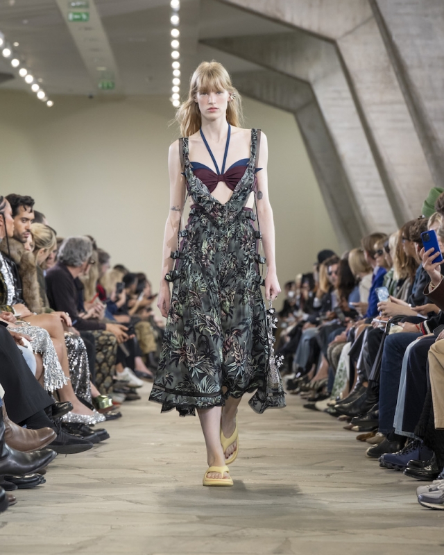 The collection’s visual world expanded through embroidered florals lifted from vintage swim caps, tropical prints, poisonous-sweet colours and lived-in leather jackets that added grit to the softness. Colour played a psychological role—idyllic yellows, blues and peaches from a 1950s dream collided with deeper marine and emerald tones, signalling something more mysterious beneath the surface .