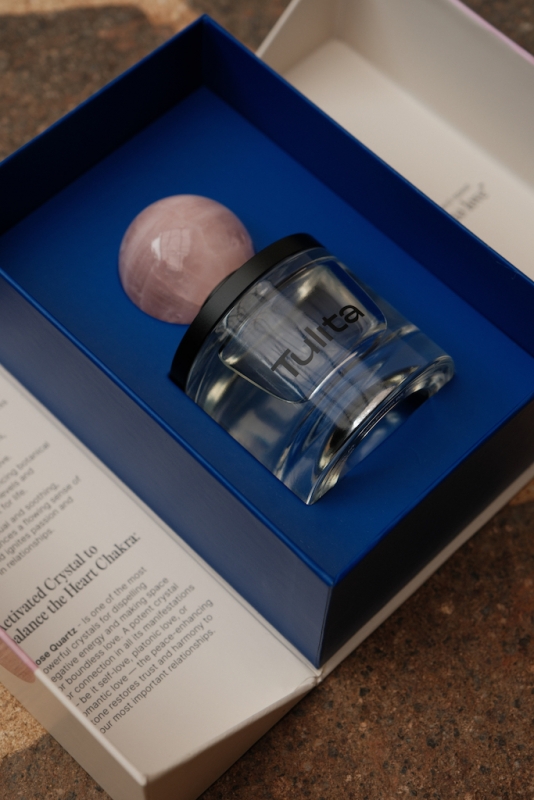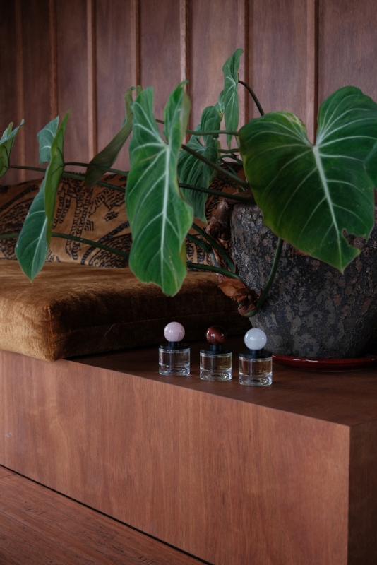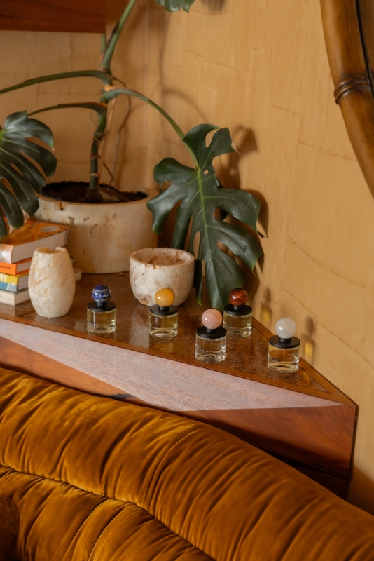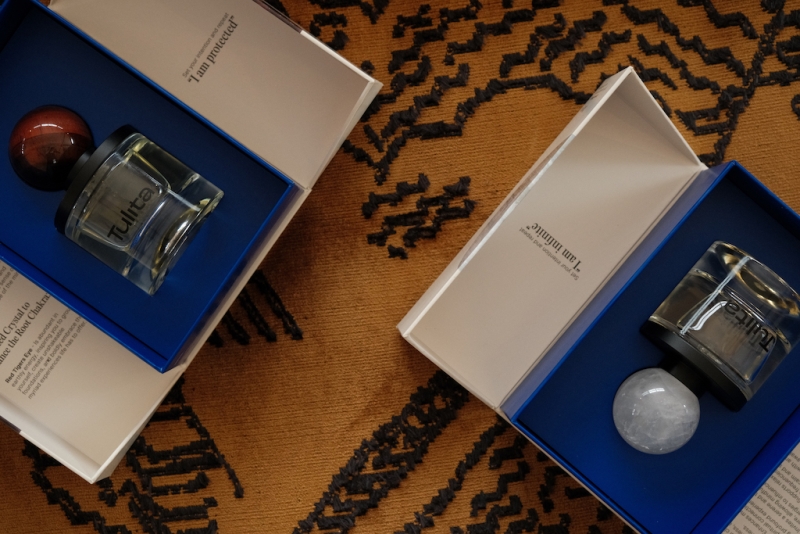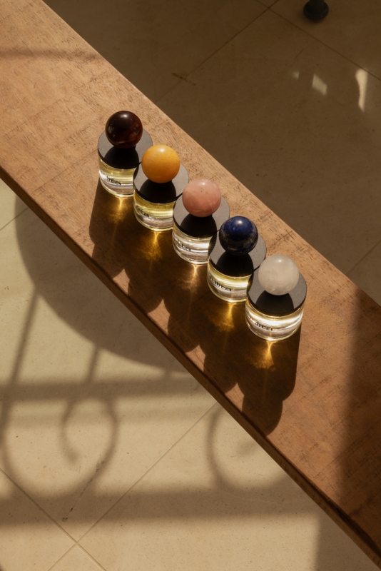 Every bottle is topped with a hand-carved, activated crystal that catches light beautifully — a sculptural detail that adds meaning and a tactile ritual to the daily act of applying fragrance. Once the bottle is empty, the crystal can be repurposed as a Gua Sha tool, extending the object’s life in a thoughtful way.