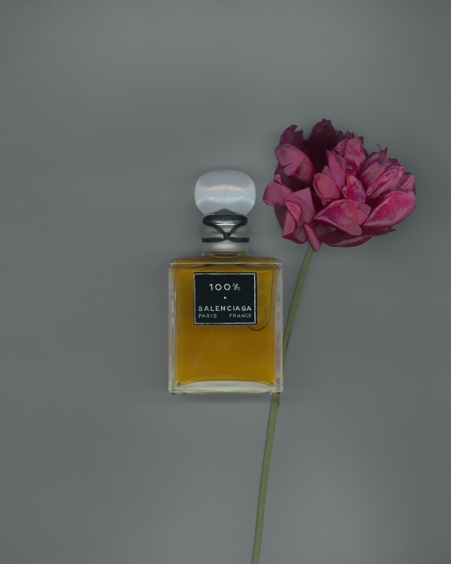 The use of the scanner held symbolic meaning. It mirrored the House’s recreation of the original Le Dix flacon from 1947—a bottle located only after a fifteen-year archival search. In Jebb’s images, sketches of the original packaging and advertising materials resurfaced like rediscovered blueprints, grounding the campaign in M. Balenciaga’s legacy while pushing the language of perfume visuals into something starkly contemporary.